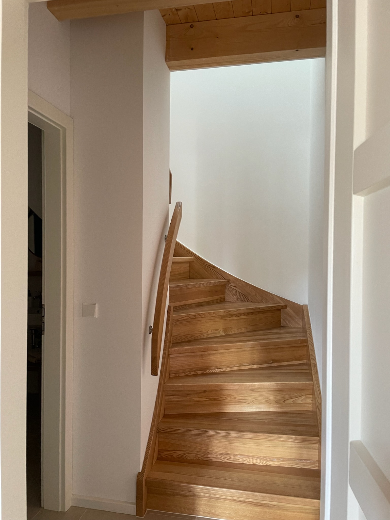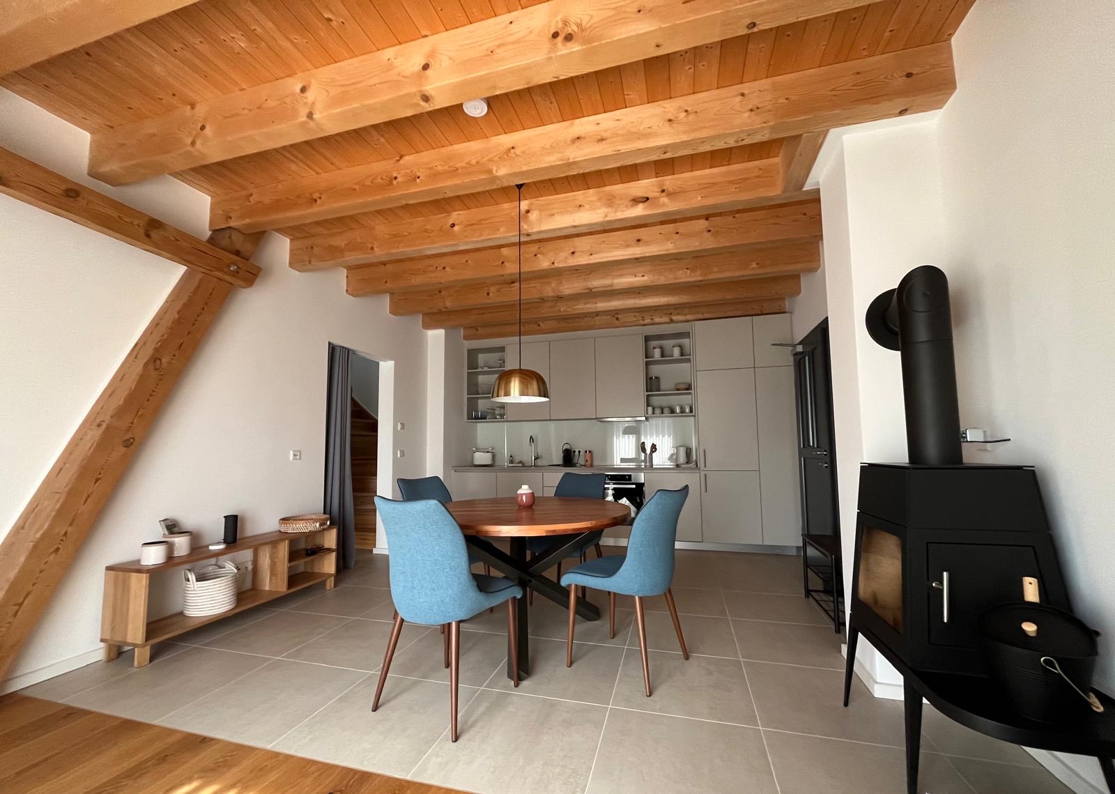 Beim Betreten der Wohnung erwartet Sie eine großzügige, offen gestaltete Raumaufteilung: Wohnbereich, Essplatz und voll ausgestattete Küche gehen fließend ineinander über. Die hochwertigen Holzmöbel, größtenteils handgefertigt vom Tischler, schaffen eine warme, wohnliche Atmosphäre.