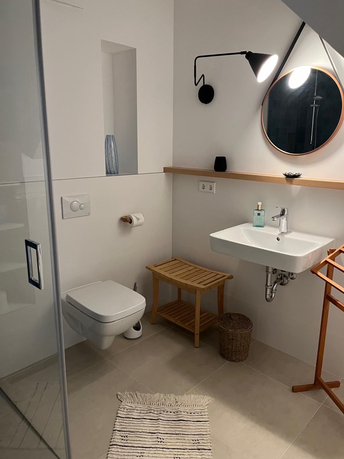 Zwei separate Badezimmer – eines mit Dusche, eines mit Badewanne – sorgen für Komfort und Flexibilität.