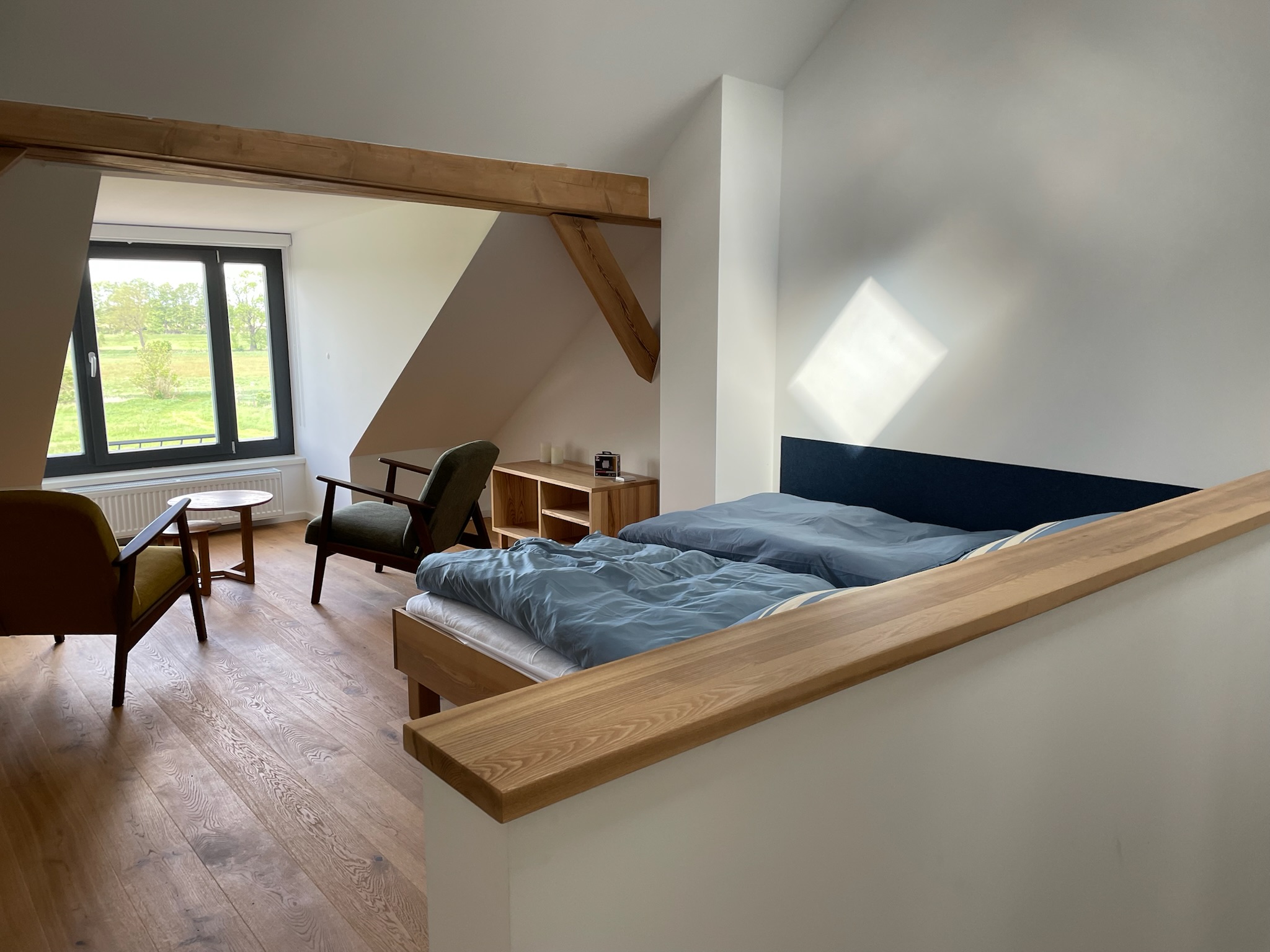 2. OG: Offenes Wohnschlafzimmer mit zusätzlichem Doppelbett (trennbar in zwei Einzelbetten) und gemütlicher Sitzgruppe unter der Dachgaube. Ideal zum Lesen, Spielen oder einfach nur Schauen – mit weitem Blick ins Grüne und auf den Naturpool