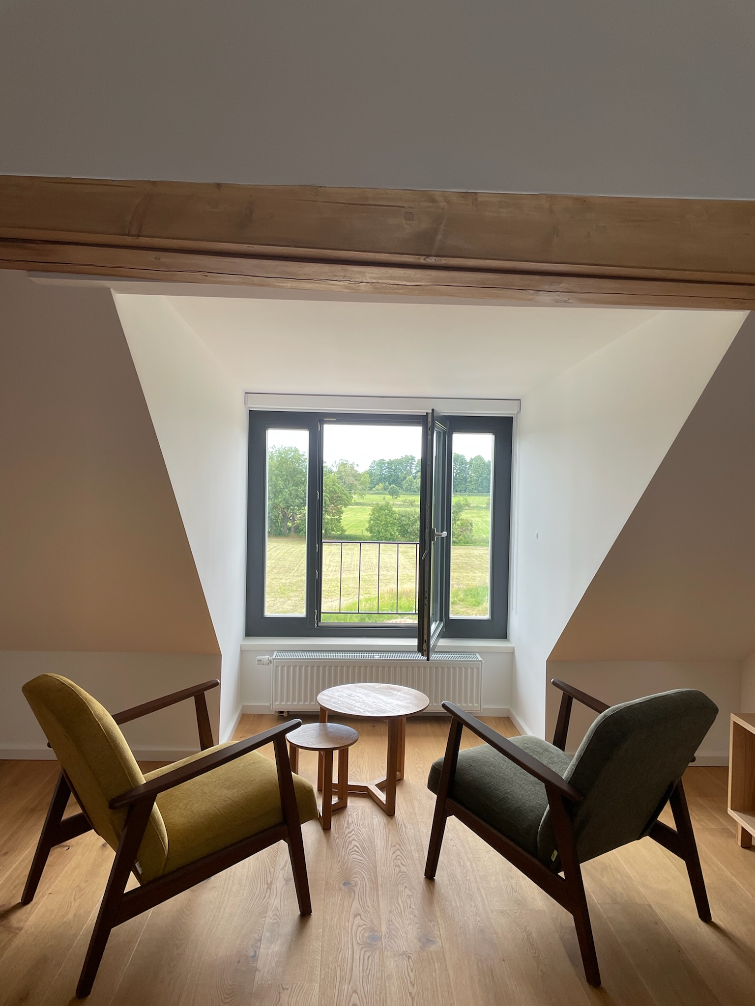 Das Apartment befindet sich im ersten Obergeschoss eines historischen Scheunenensembles am Rande eines Naturschutzgebiets – perfekt für alle, die Naturbeobachtungen lieben, besonders in der Kranichzeit.