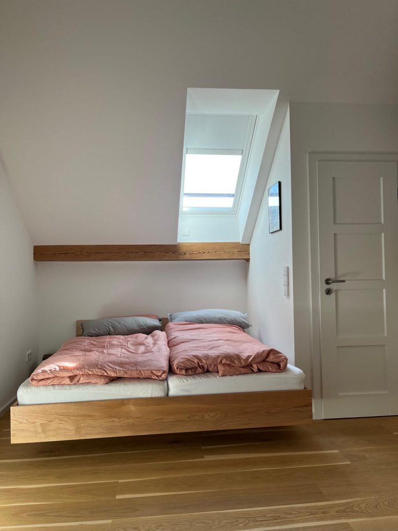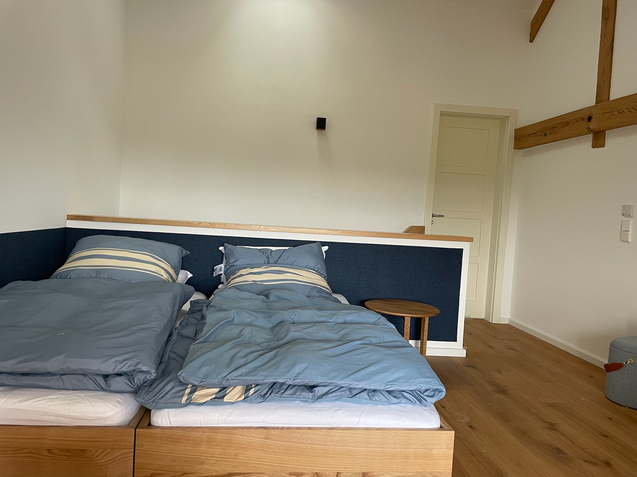 Ein Schlafzimmer mit Doppelbett ist separat im 1. OG. Im offenen Wohnschlafzimmer im Dachgeschoss befindet sich ein zweites Doppelbett, welches auch in zwei Einzelbetten separiert werden kann.