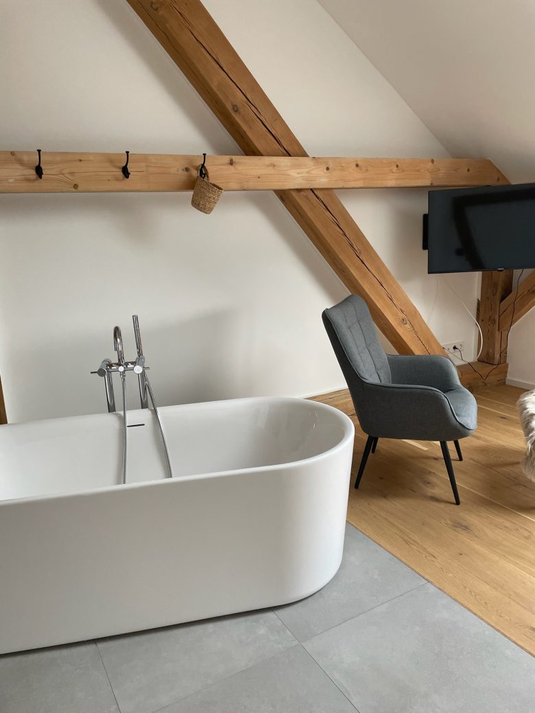 Das dreigeschossige Loft für bis zu 6 Personen kombiniert Scheunencharakter mit urbaner Eleganz. Großzügige Wohnflächen, ein offenes Raumkonzept und eine freistehende Badewanne mit Blick ins Luch machen das Kranichloft zu einem Ort der besonderen Art.
